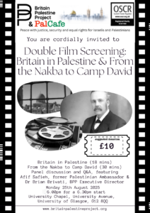 film screening and panel discussion and Q&A co-hosted with the Britain Palestine Project with guests Afif Safieh, former Palastinian Ambassador and Dr Brian Brivati, BPP Executive Director.
