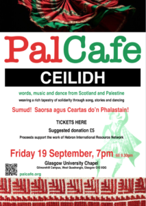 Our first ceilidh event was a big sold-out success –‘ceilidhs keep communities connected’. All proceeds will support the work of Hebron International Resource Network. There will be more pop-up PalCeilidhs over the coming months, featuring acclaimed traditional and contemporary musicians from the Gaidhealtachd, Glasgow, Scotland and beyond, weaving a rich tapestry of solidarity through song, stories, spoken word and dancing!.